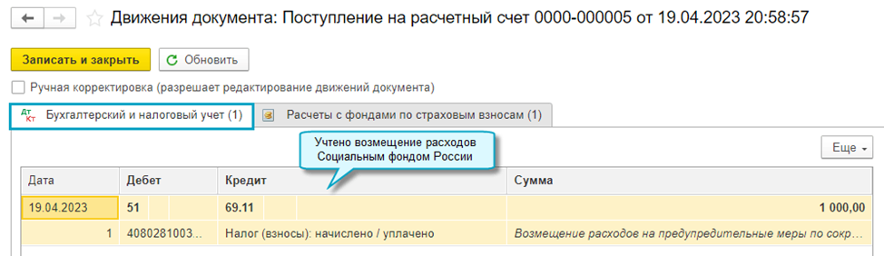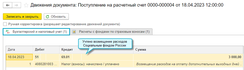 Аналогично выполняется разметка при поступлении из Социального фонда России возмещения расходов.