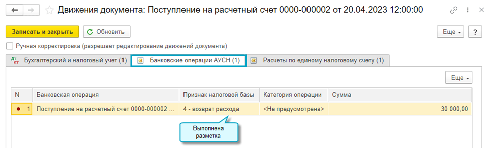 Добавлена возможность выполнять разметку для АУСН операций по возврату денежных средств с единого налогового счета (ЕНС) и по возмещению Социальным фондом России расходов на оплату дополнительных выходных дней для ухода за детьми-инвалидами, на выплату пособия на погребение, на финансирование предупредительных мер по сокращению производственного травматизма и других расходов.