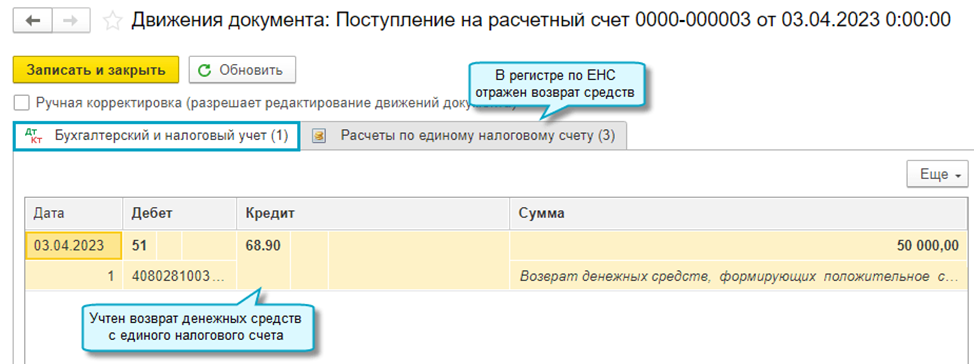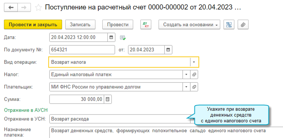 Добавлена возможность отразить возврат денежных средств с единого налогового счета в бухгалтерском учете и регистре по единому налоговому счету.