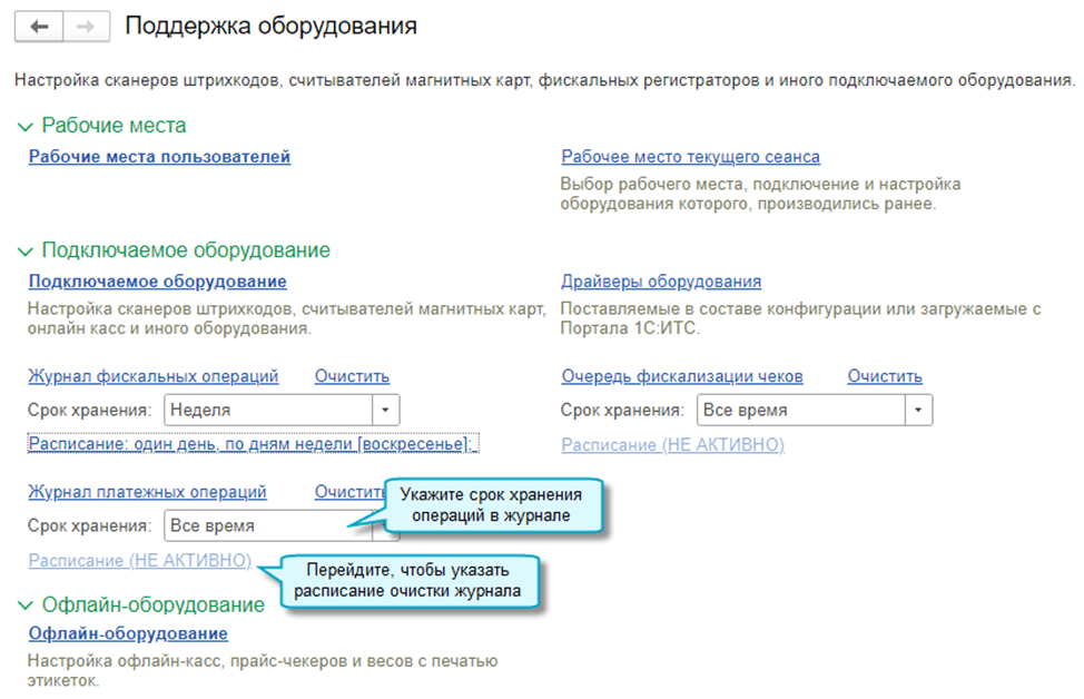 Добавлена возможность настроить срок хранения и расписание очистки журнала фискальных операций, журнала платежных операций и очереди фискализации чеков.