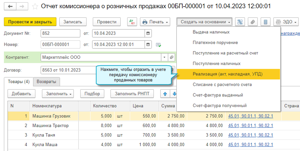 Упрощен порядок создания документов по учету продажи товаров на маркетплейсах, по договорам комиссии. Теперь достаточно загрузить Отчет о продажах и на его основании отразить в учете передачу проданных товаров маркетплейсу, комиссионеру. Такой способ создания документов предназначен для случаев, когда все переданные комиссионеру товары реализованы.