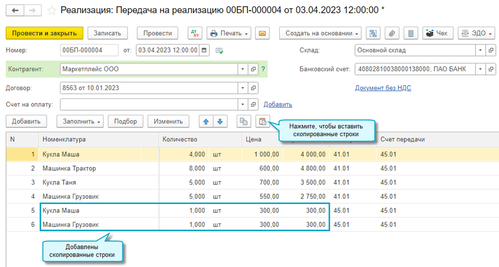 Также в Отчеты о продажах и о списании добавлена возможность копировать и вставлять строки с информацией по товарам. Например, скопировать строки по товарам из нескольких документов Передачи на реализацию и вставить их в один Отчет о продажах.