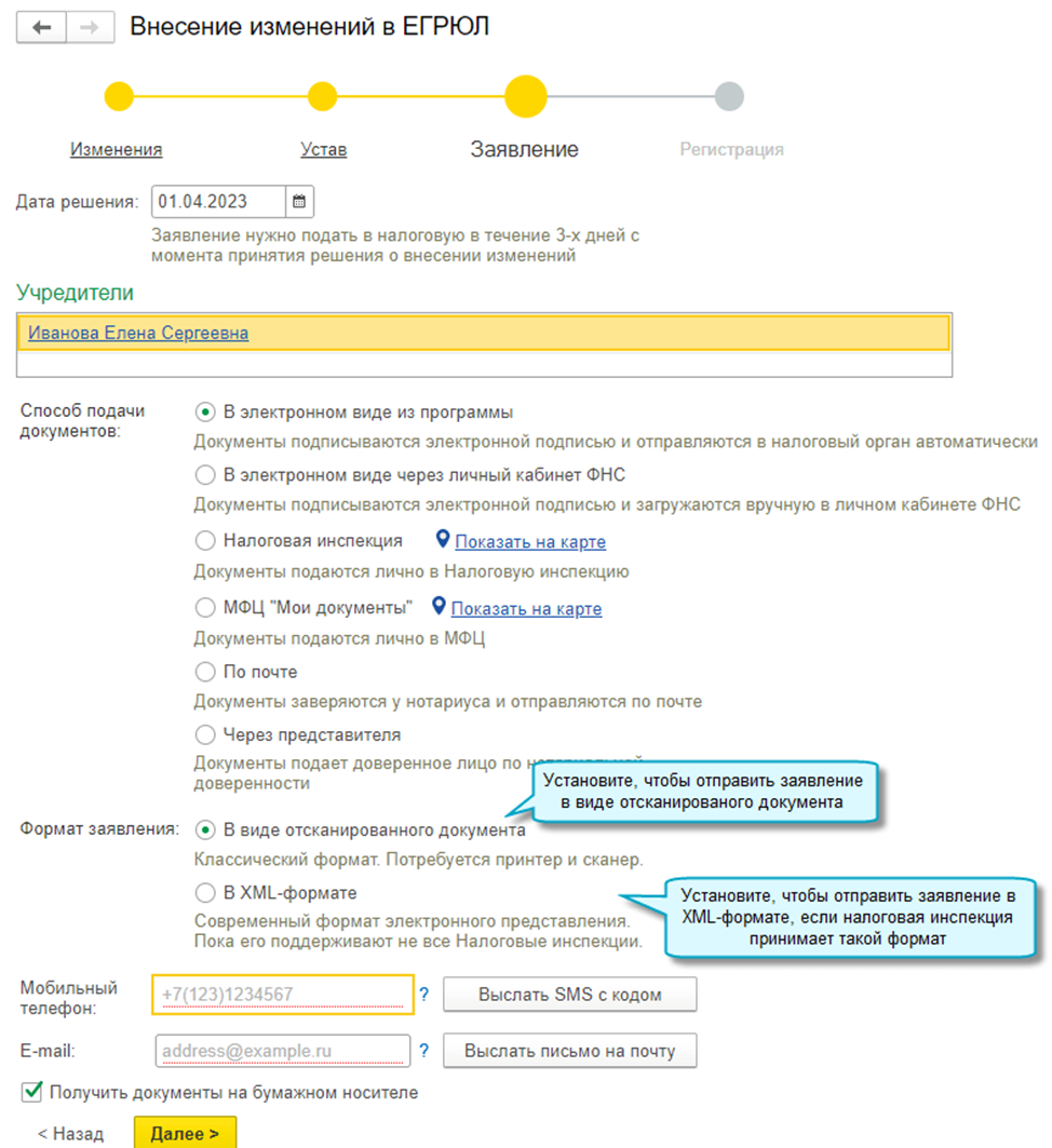 Добавлена возможность выбора формата подачи заявлений на изменения в ЕГРЮЛ, ЕГРИП при подаче документов в электронном виде. Отправить заявления можно или в виде отсканированного документа, или в XML-формате. Выбирайте XML-формат, когда он поддерживается налоговой инспекцией, в которую отправляются документы.
