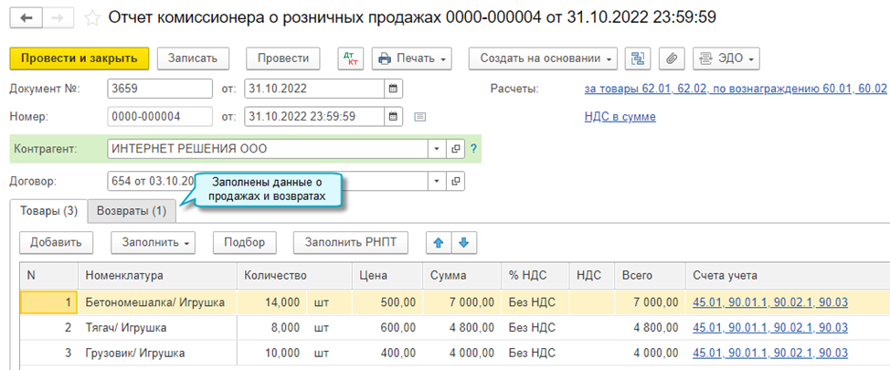 Создается несколько документов по реализации отгруженных товаров и возврату товаров, когда реализуются или возвращаются товары, переданные в доставку в разные месяцы. По каждому месяцу - отдельный документ.