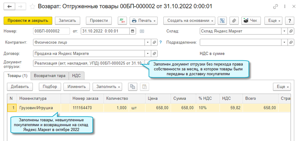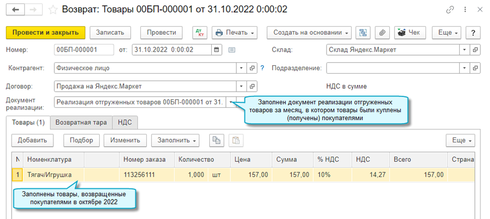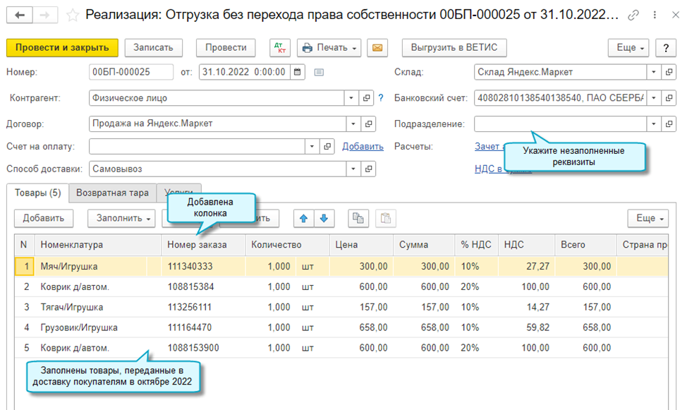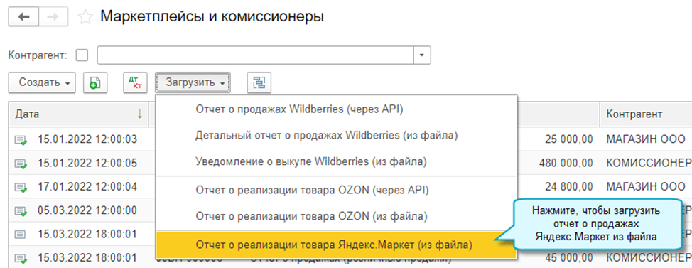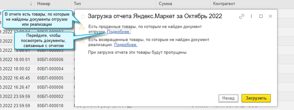 Добавлена возможность загрузить операции с товарами из отчета о продажах Яндекс.Маркет. При загрузке отчета создаются документы по отгрузке, реализации и возврату товаров. Во все документы добавлена новая колонка с номером заказа.