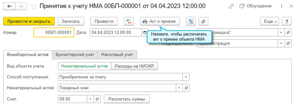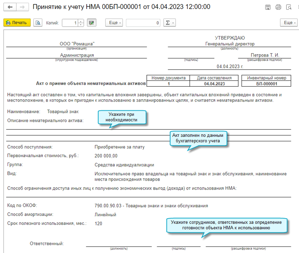 Добавлена печатная форма акта о приеме объекта нематериальных активов. Оформляется он при завершении капитальных вложений в создание или приобретение объекта и подтверждает его готовность к использованию в запланированных целях.