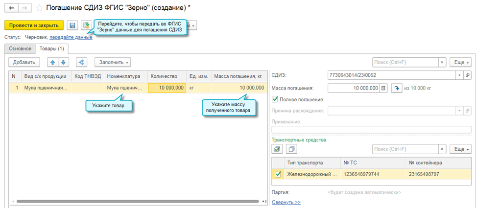 Полный интерфейс: меню "Администрирование - Сервис - Обмен с ФГИС "Зерно" - Погашение СДИЗ".