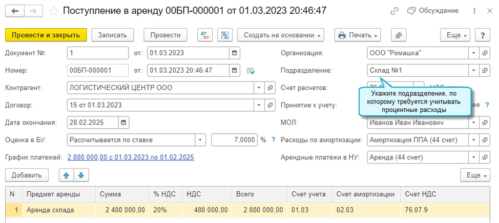 Для этого достаточно указать подразделение при отражении в учете поступления предметов аренды в аренду (лизинг) или поступления основных средств и материалов с рассрочкой оплаты.