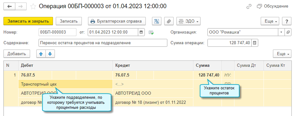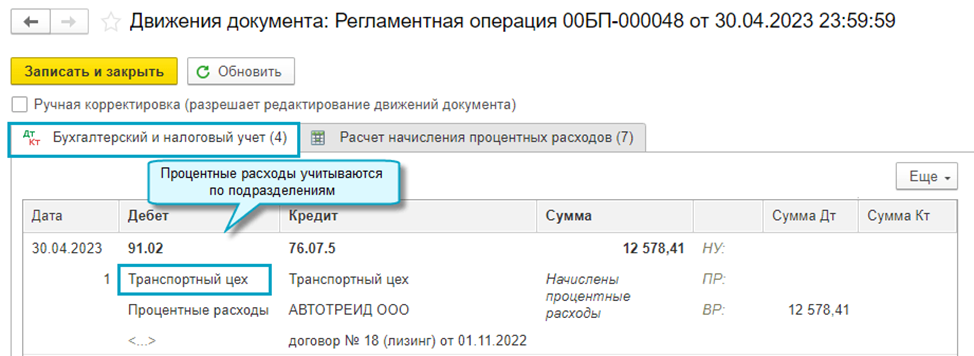 Учет процентных расходов по аренде и по рассрочке по подразделениям