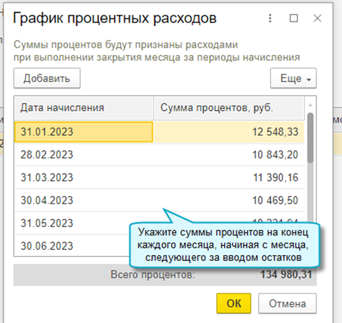 - график начисления процентных расходов, если стоимость права пользования активом рассчитывалась путем дисконтирования арендных или лизинговых платежей. По этому графику проценты будут включаться в прочие расходы регламентной операцией при закрытии месяца
