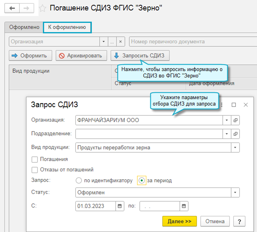 Полный интерфейс: меню "Администрирование - Сервис - Обмен с ФГИС "Зерно" - Оформление СДИЗ".