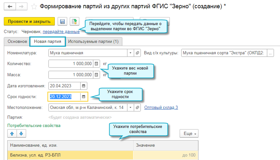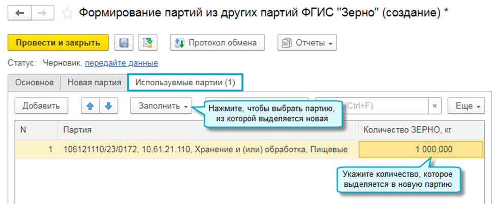 При выполнении операций с зерном и продуктами его переработки из текущих партий можно сформировать новые партии: выделить меньше размером, при определенных условиях объединить несколько партий в одну.