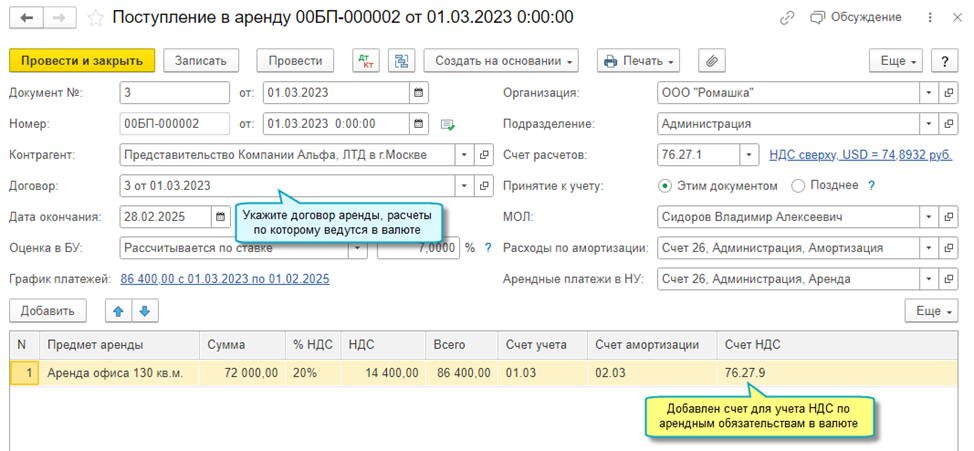 Добавлена возможность учета аренды по ФСБУ 25/2018 «Бухгалтерский учет аренды» для арендатора по договорам с расчетами в иностранной валюте, когда арендодатель выставляет счета-фактуры с НДС.