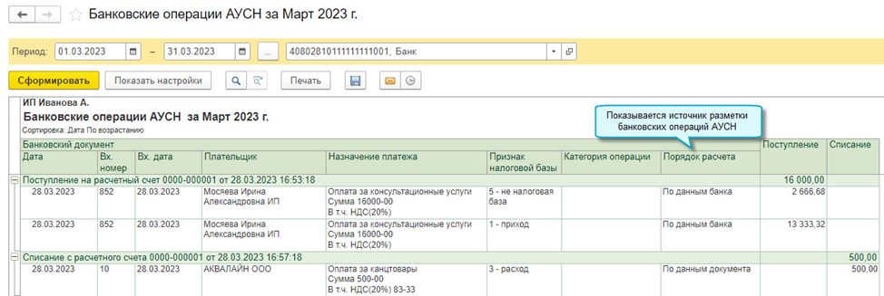 Полный интерфейс: меню "Отчеты - АУСН - Банковские операции АУСН".