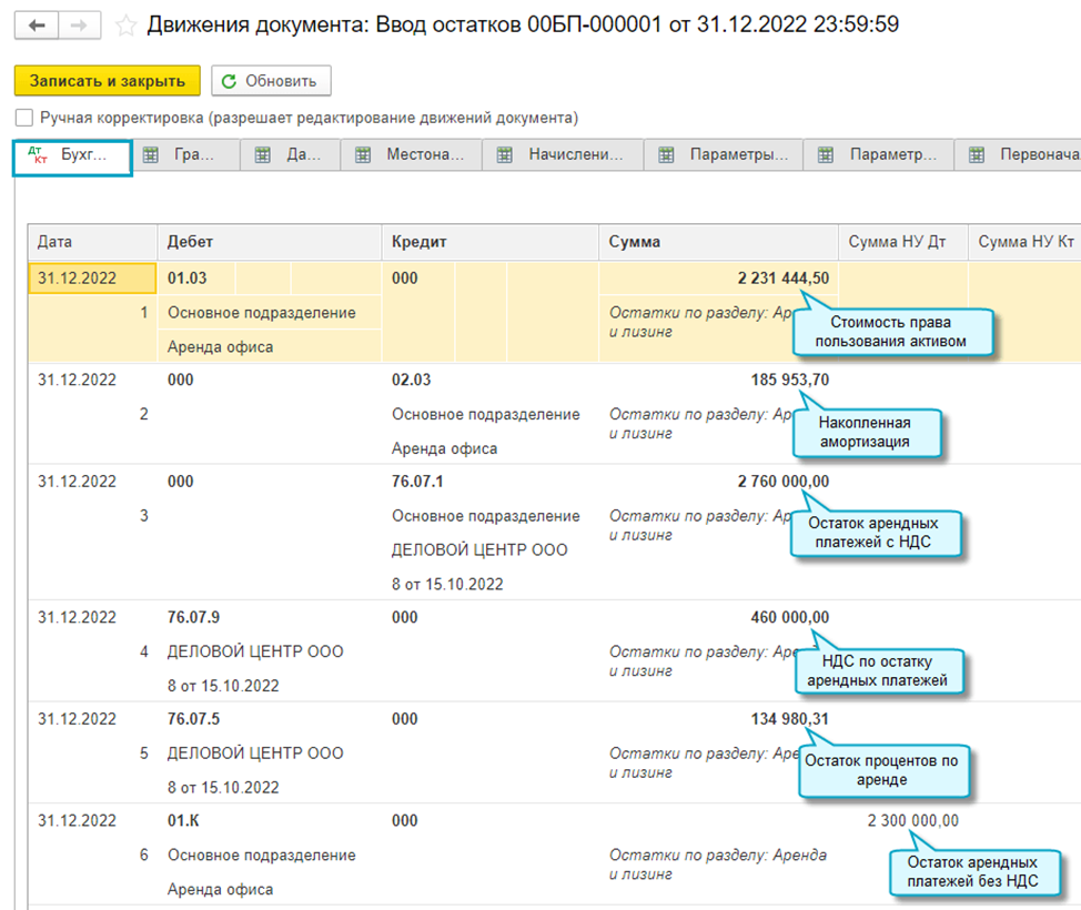 Аналогично вводятся начальные остатки по договорам лизинга.