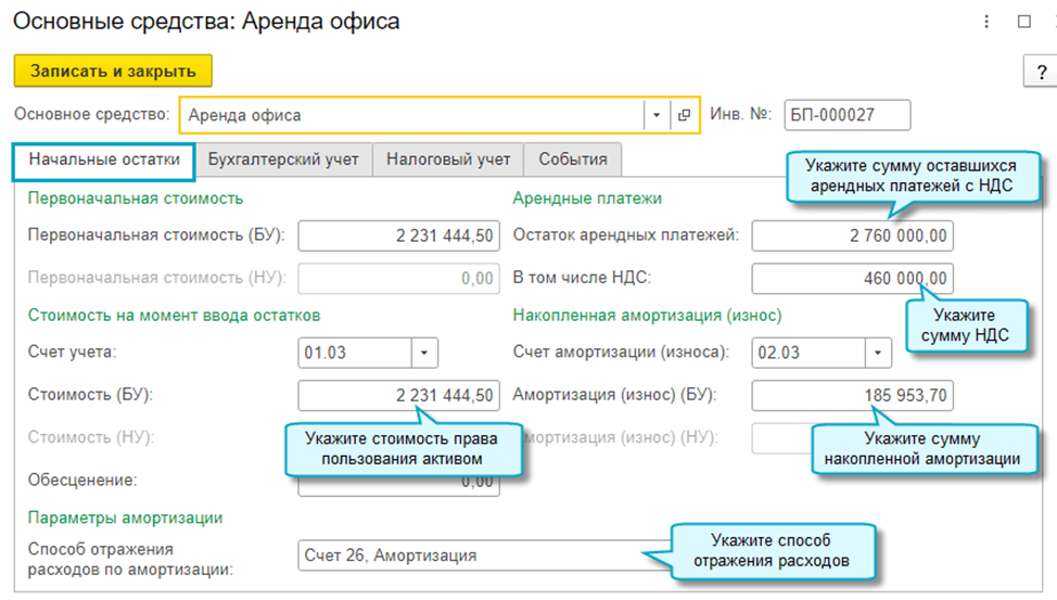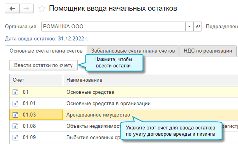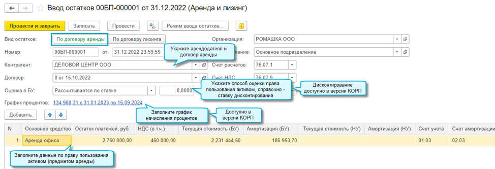 Упрощен ввод начальных остатков по договорам аренды у арендатора и по договорам лизинга у лизингополучателя, когда признаются права пользования активами и обязательства по аренде по ФСБУ 25/2018 "Бухгалтерский учет аренды". При начале использования приложения остатки вводятся теперь в одном документе.