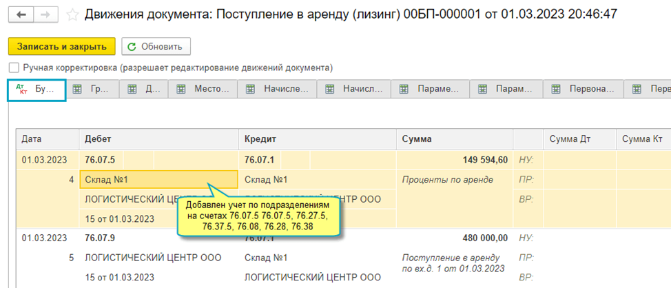 Тогда суммы будущих процентов будут учитываться в разрезе подразделений на счетах учета процентов по аренде и по рассрочке: 76.07.5, 76.27.5, 76.37.5, 76.08, 76.28, 76.38. И на основе этого будет заполняться подразделение на счете 91.02 "Прочие расходы" для процентных расходов, начисляемых регламентной операцией при закрытии месяца.