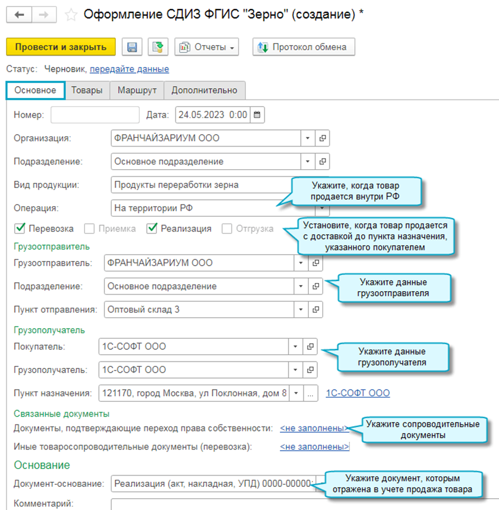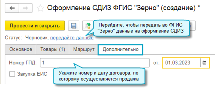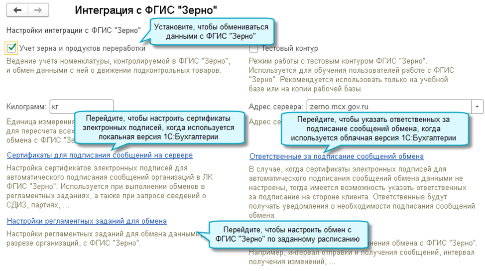Добавлена возможность обмена данными о зерне и продуктах его переработки с Федеральной государственной информационной системой "Зерно". Во ФГИС "Зерно" вносится информация о злаковых, зернобобовых и масличных культурах и продуктах переработки зерна (Закон РФ от 14.05.1993 № 4973-1, Постановление Правительства РФ от 09.10.2021 № 1722).