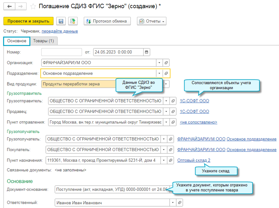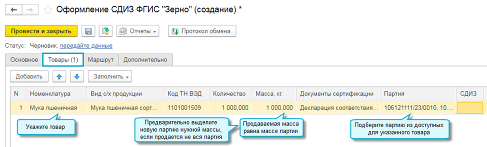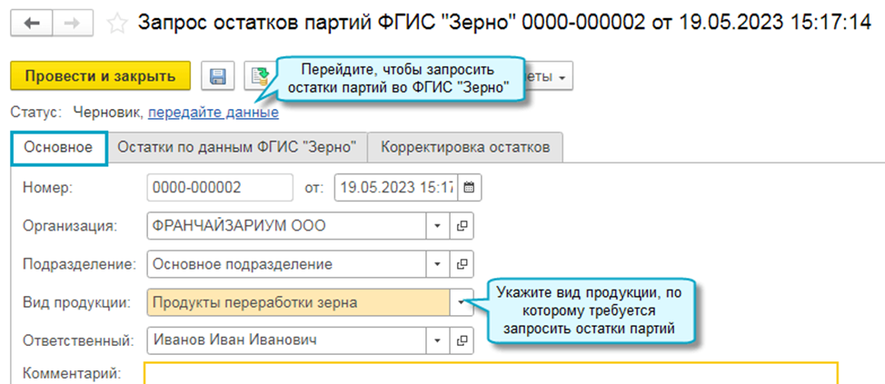 - загрузите из ФГИС «Зерно» текущие остатки партий зерна и продуктов его переработки