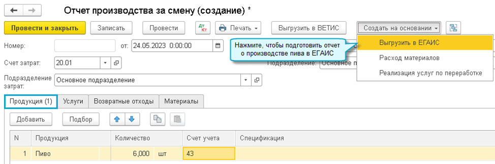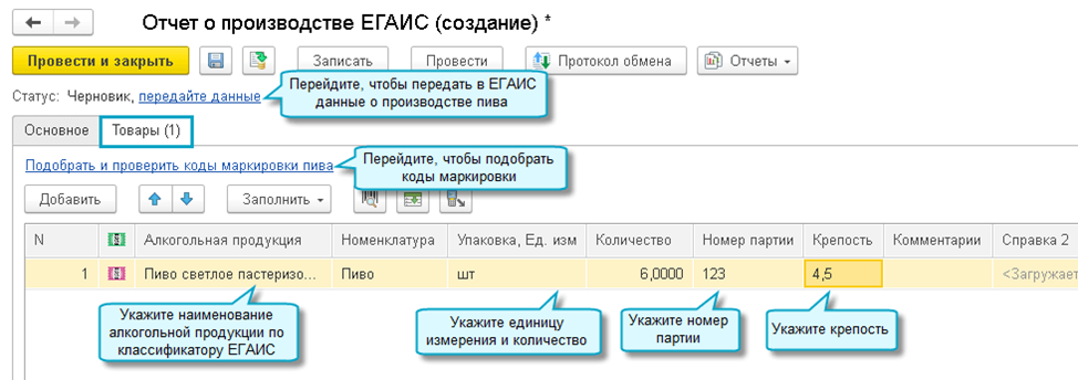 Добавлена возможность подготовить и передать в ЕГАИС данные о производстве пива с указанием кодов маркировки.