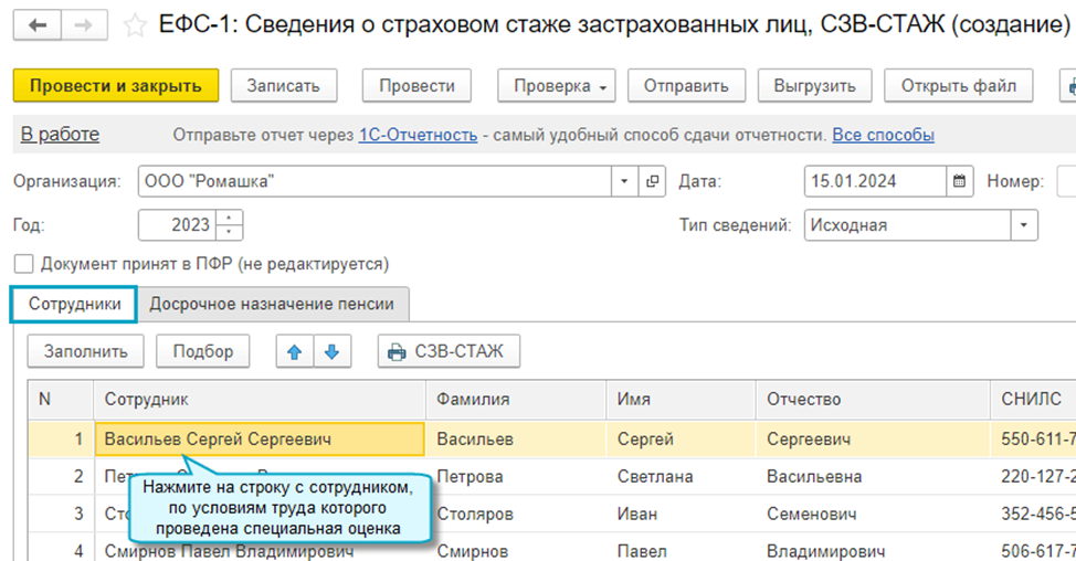 После сохранения сведений по сотруднику при печати формы ЕФС-1 заполняются результаты специальной оценки условий труда в подразделе 1.2 раздела 1.