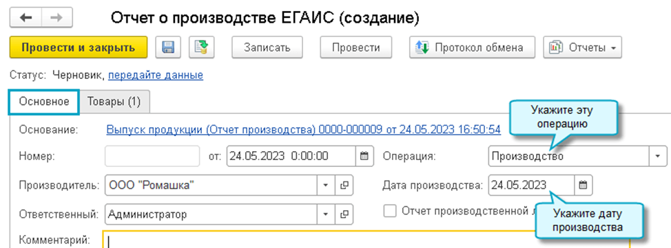 Полный интерфейс: меню "Администрирование - Сервис - Обмен с ЕГАИС - Отчеты о производстве ЕГАИС".