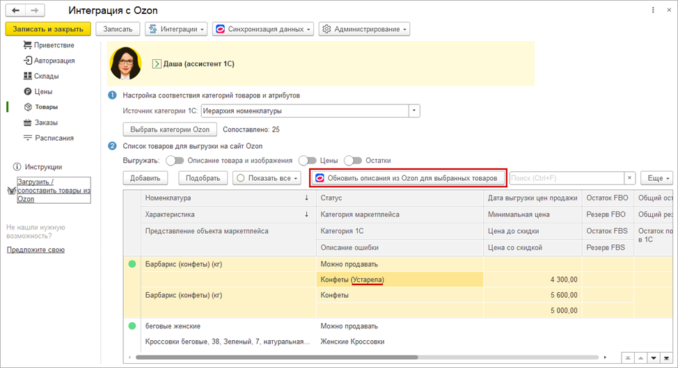 Чтобы обновить информацию в существующих карточках товаров 1С используйте кнопку "Обновить описания из Ozon для выбранных товаров" на шаге "Товары" помощника интеграции. Для обновления сразу всех товаров выделите все строки с помощью горячих клавиш Ctrl+A.Функциональность позволяет: