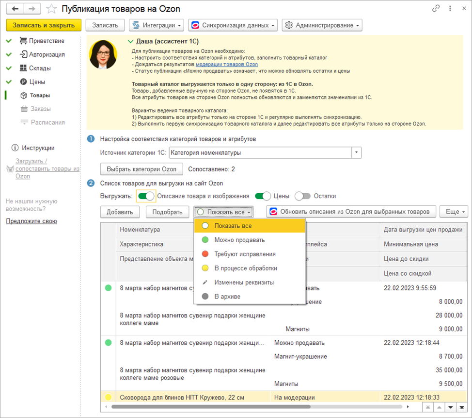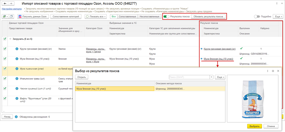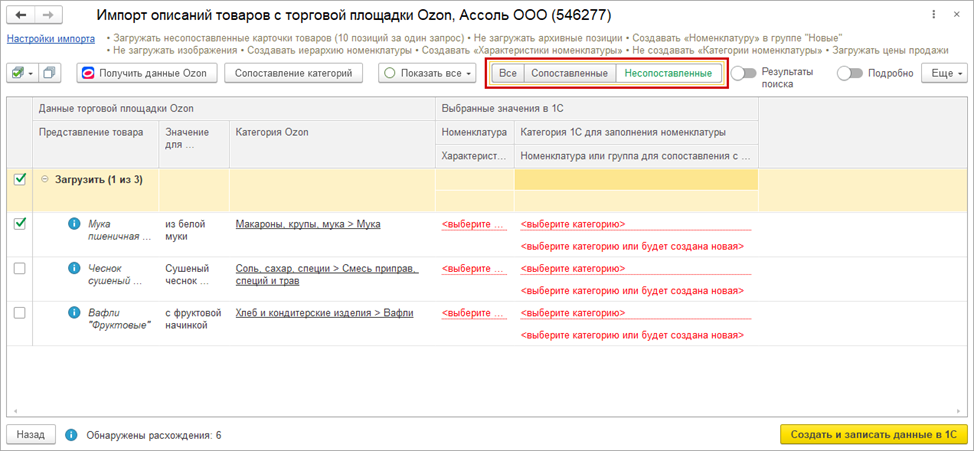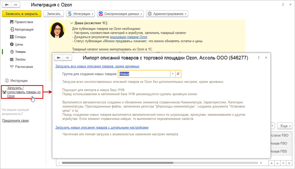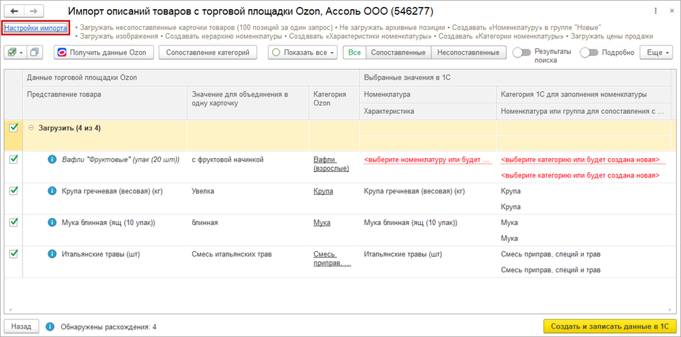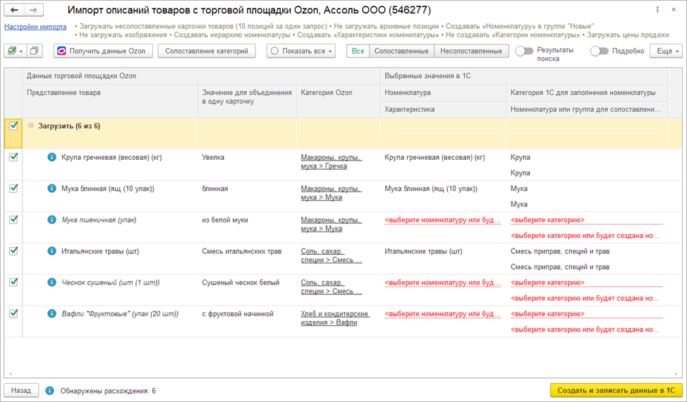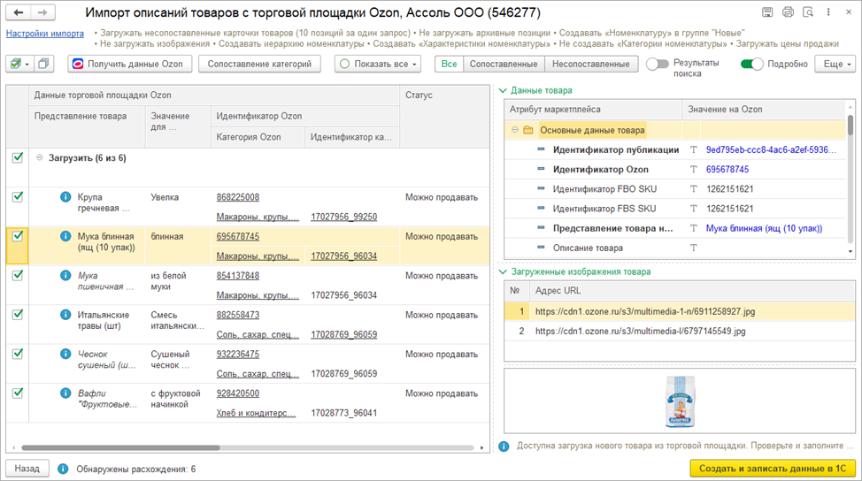 Товары, добавленные на стороне торговой площадки Ozon, можно загружать в 1С и сопоставлять с аналогичными товарами в учетной системе.