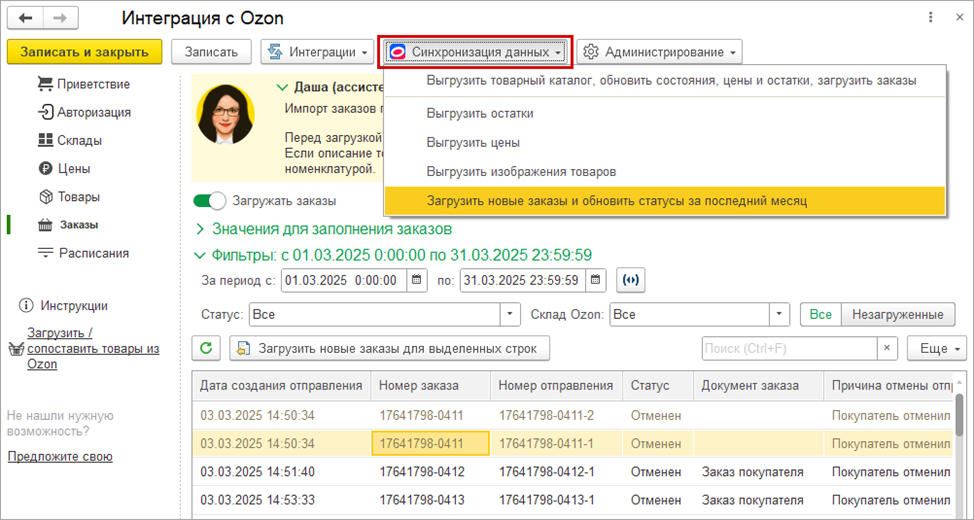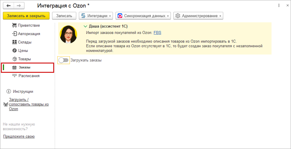 Для оперативной обработки заказов, реализована загрузка заказов из марекетплейса в 1С, настройка загрузки выполняется на закладке "Заказы".