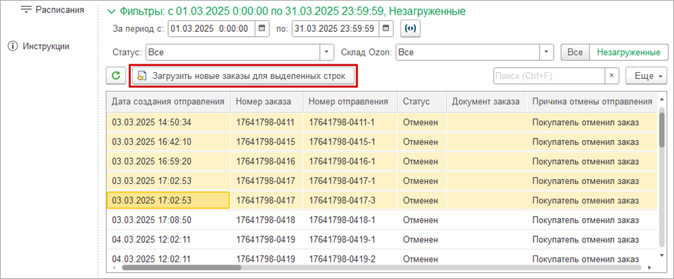 По данным каждого заказа маркетплейса можно создать документ "Заказ покупателя". Чтобы создать заказы необходимо выбрать строки заказов маркетплейса и нажать "Загрузить новые заказы для выделенных строк".