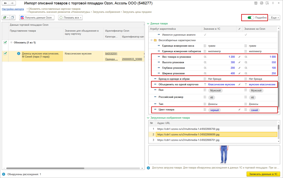 Чтобы узнать, какие данные товара изменились, нажмите "Подробно". Расхождения будут выделены синим цветом.