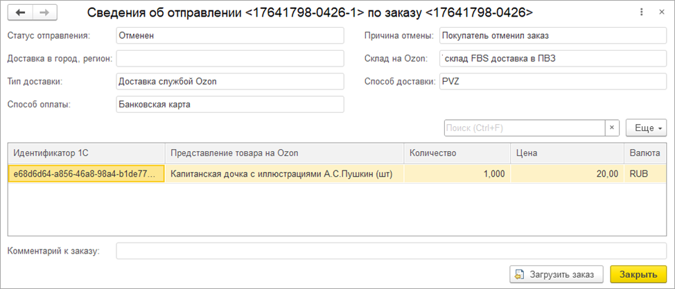 Из формы сведений о заказе также можно создать "Заказ покупателя" по кнопке "Загрузить заказ".