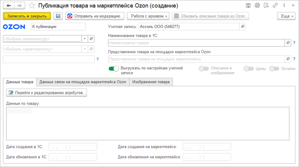 В результате загрузки в 1С переносятся все новые товары (не загруженные ранее) из магазина Ozon, кроме архивных. Перед созданием новых товаров в 1С выполняется автоматический поиск по штрихкодам, артикулам, наименованиям и другим атрибутам, товар создается только в случае, если совпадение не найдено.Для нового товара будут записаны: