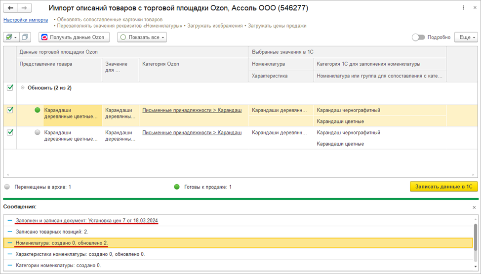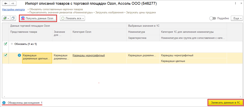 Карточки товаров 1С, загруженные ранее можно актуализировать по данным Ozon. Такая возможность будет полезна если карточки товаров заполняются на стороне маркетплейса, а в 1С ведется учет по остаткам и рассчитываются цены.