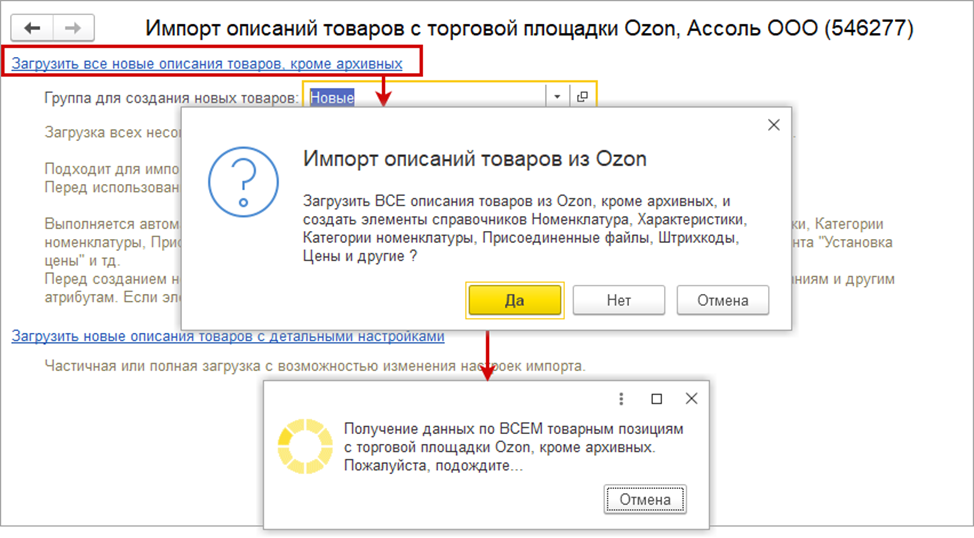 Нажмите на ссылку "Загрузить все описания товаров, кроме архивных" и подтвердите действие, начнется загрузка информации о товарах. Дождитесь окончания загрузки, она может занять длительное время.