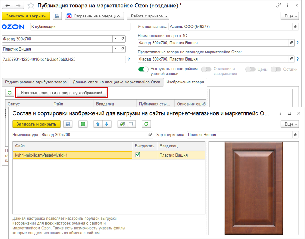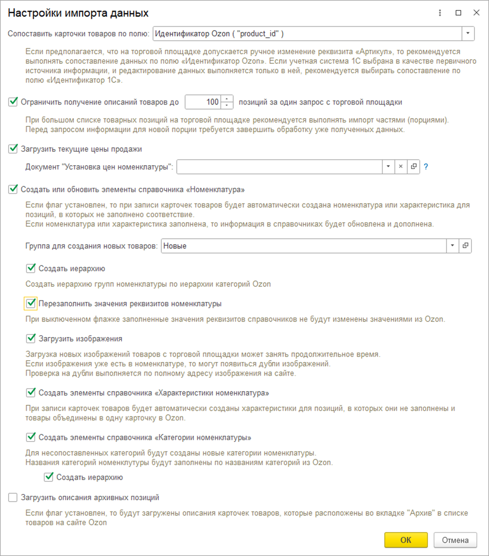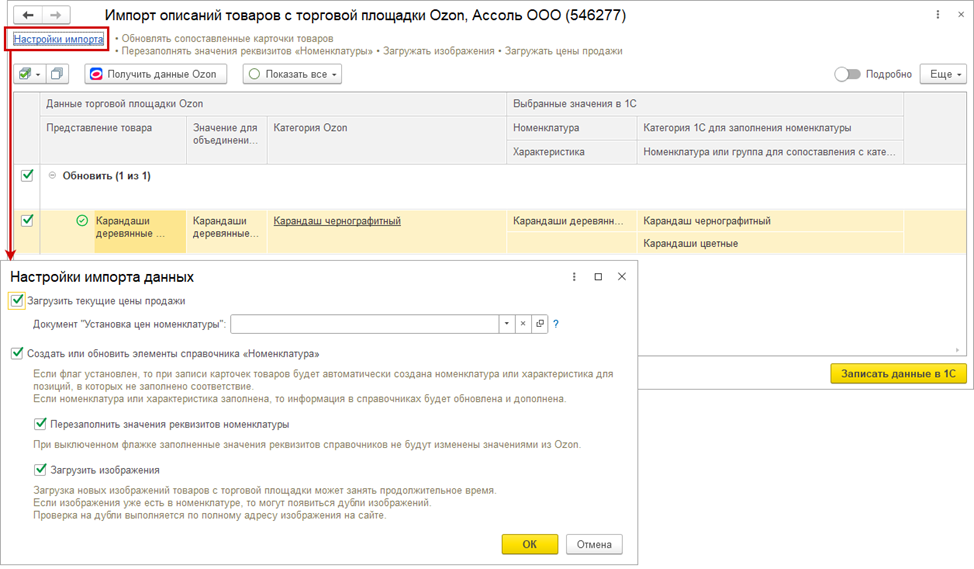 Если установлен флажок "Создать или обновить элементы справочника "Номенклатура"" , то при записи карточек товаров Ozon будет автоматически создана номенклатура или характеристика в 1C для позиций, в которых не заполнено соответствие. Если соответствие номенклатуры или характеристики заполнено, то информация в справочниках будет обновлена и дополнена.
