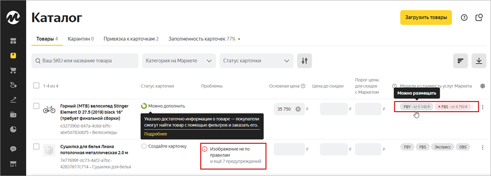 Перейдите в Товары > Каталог в личном кабинете Маркета и проверьте статус товара. В колонке "Проблемы" отобразятся ошибки, препятствующие публикации, если они есть.