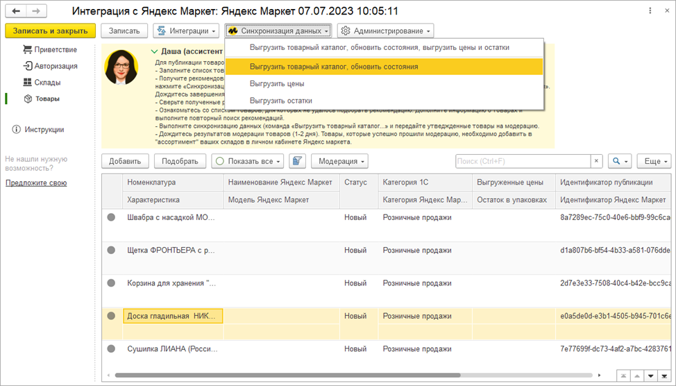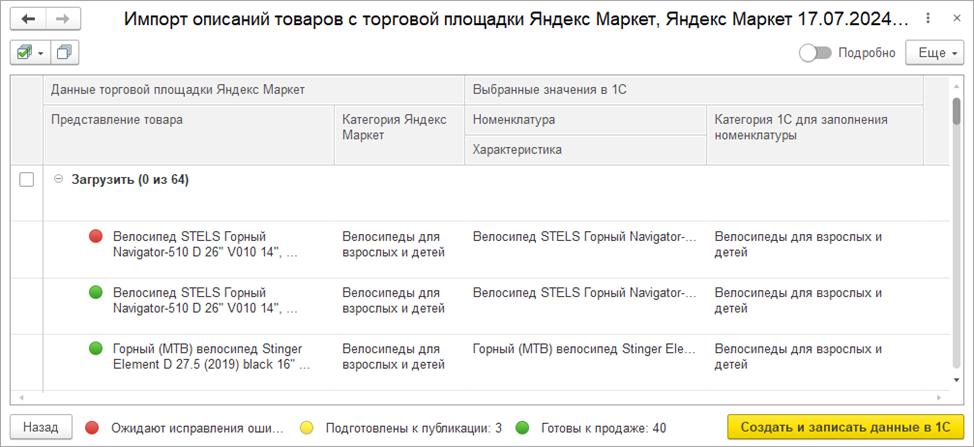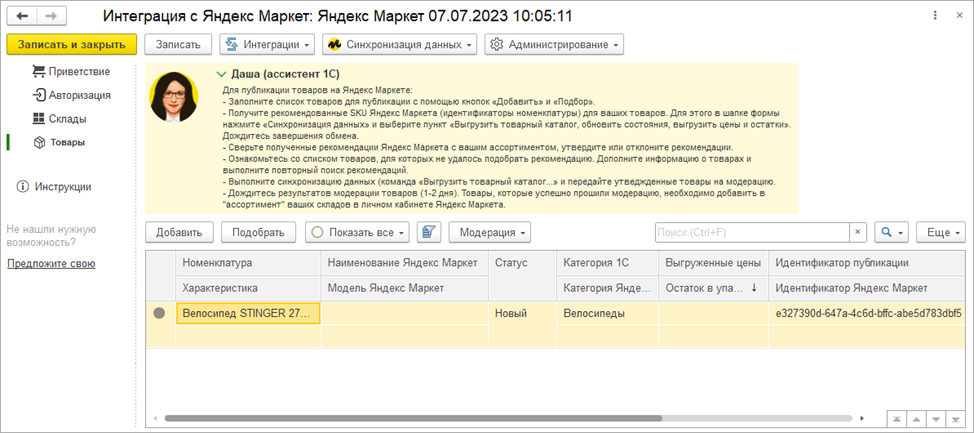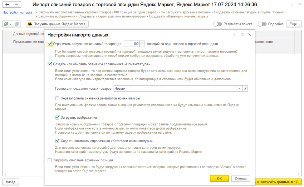 Товары из Яндекс Маркета можно загружать в 1С. Для новых товаров автоматически создаются карточки с описаниями, штрихкодами и изображениями.