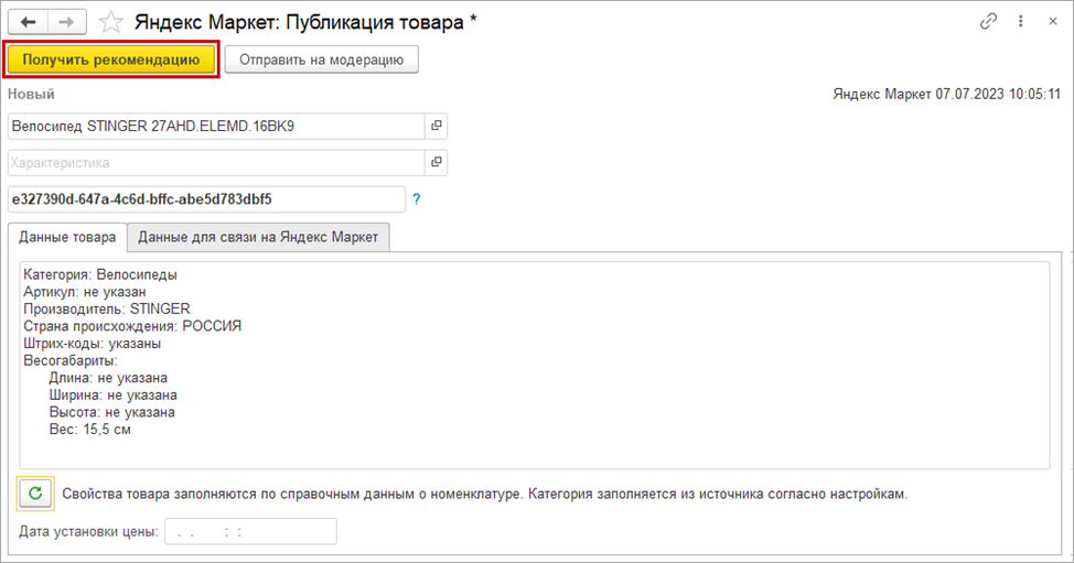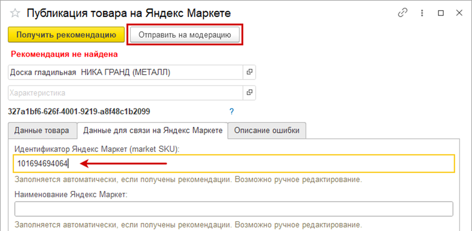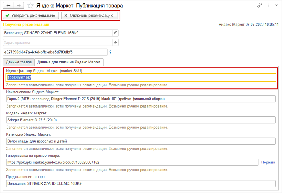 Полученная рекомендация отображается в карточке товара в поле SKU и на закладке "Данные для связи на Яндекс Маркете".