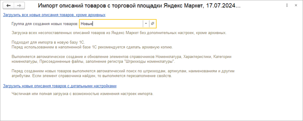 Первый вариант загрузки является более простым для начинающего пользователя. Отлично подойдет для старта работы в программе, когда в учетной системе 1С еще не созданы карточки товаров. В результате загрузки в 1С переносятся все товары из магазина Яндекс Маркет, кроме архивных. Перед записью новых товаров выполняется автоматический поиск по штрихкодам, артикулам, наименованиям и другим атрибутам, товар создается только в случае, если совпадение не найдено.