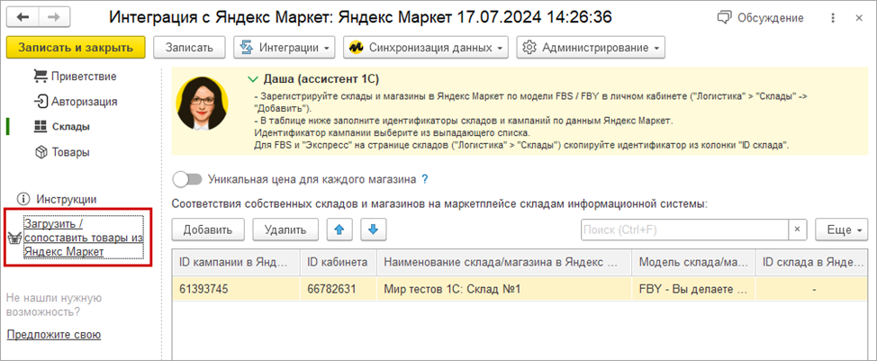 Перейти к загрузке товаров из Маркета можно после настройки складов и записи изменений (кнопка "Записать"). В левой панели станет доступна ссылка "Загрузить/сопоставить товары из Яндекс Маркет".