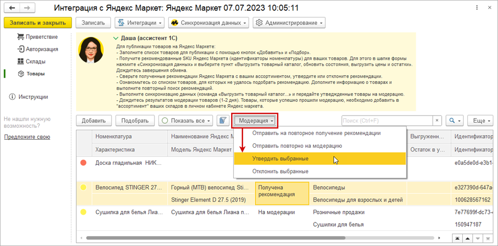 Утвердите или отклоните рекомендации с помощью команд меню "Модерация" или в карточке публикуемого товара.