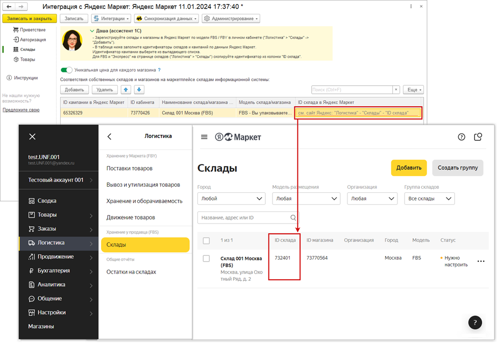 После выбора модели работы укажите идентификаторы склада в поле ID склада в Яндекс Маркет таблицы соответствия. Идентификатор склада, присвоенный площадкой Яндекс Маркета, можно узнать в разделе Логистика - Склады личного кабинете Яндекс Маркета.