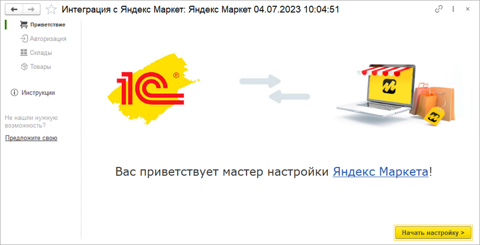 Нажмите на ссылку "Яндекс Маркет", откроется мастер настройки интеграции с Яндекс Маркетом.