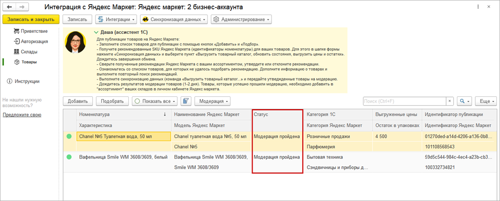 Для товаров, прошедших проверку будет установлен статус "Модерация пройдена", данные товары готовы к продаже.