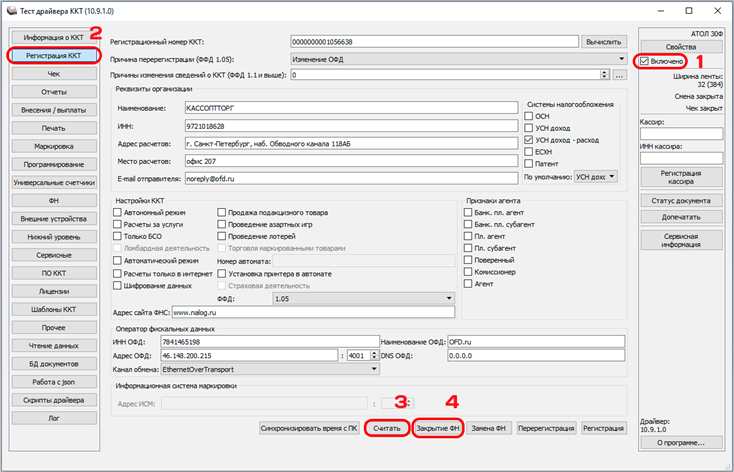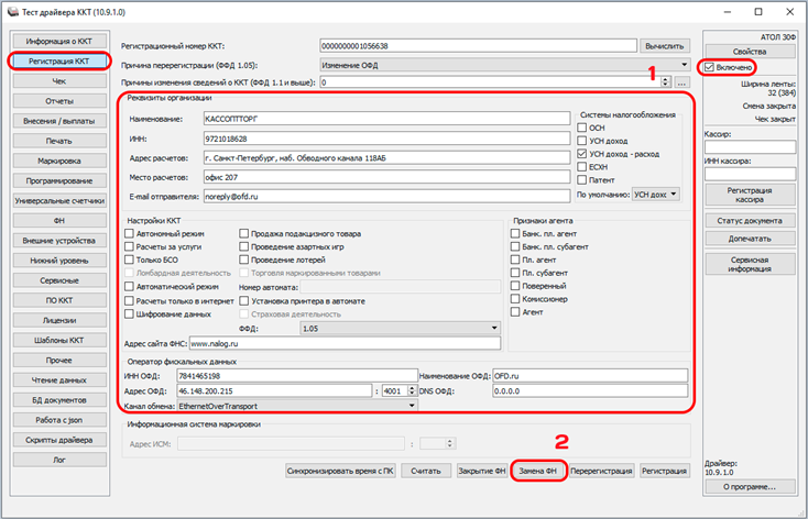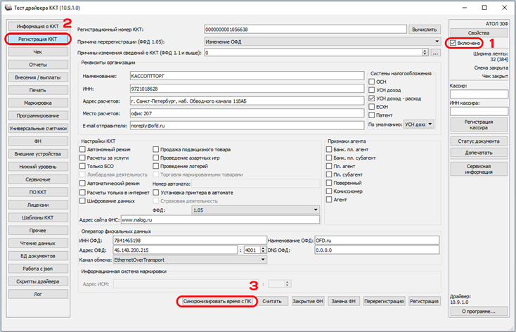 - в Тест Драйвере ККТ убедитесь, что галочка стоит на Включено;