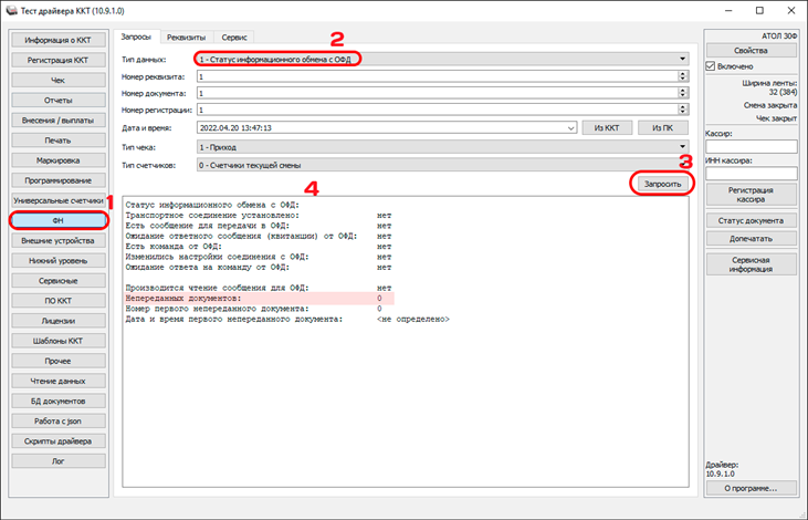 - выйдет кассовый чек, на котором должна быть надпись Непереданных ФД ... (количество). Если у вас там не 0, то подождите пару минут и сформируйте отчет еще раз;