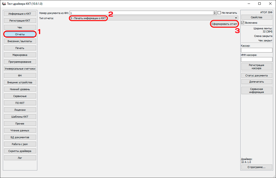 - в поле тип отчета выберите 5 Печать Информация о ККТ;
