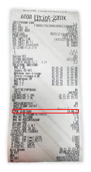 - выйдет чек, в графе СРОК ДЕЙСТВИЯ будет указана дата окончания действия фискального накопителя.
