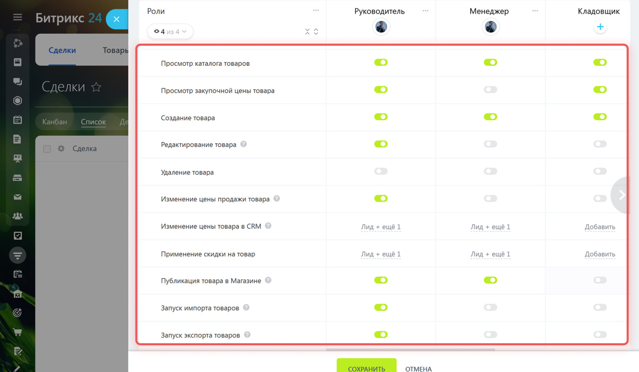 Эта группа прав регулирует внесение изменений в цены товаров непосредственно в CRM: